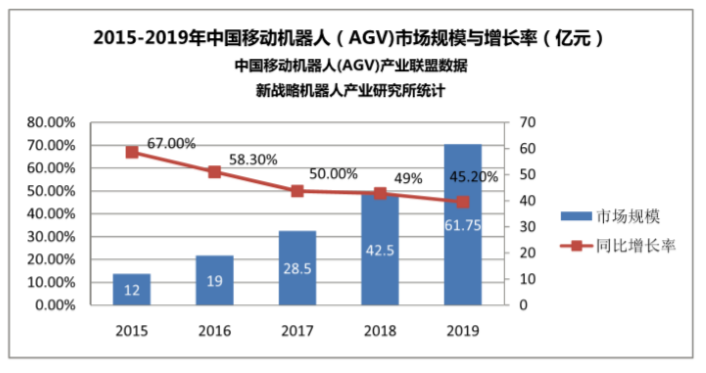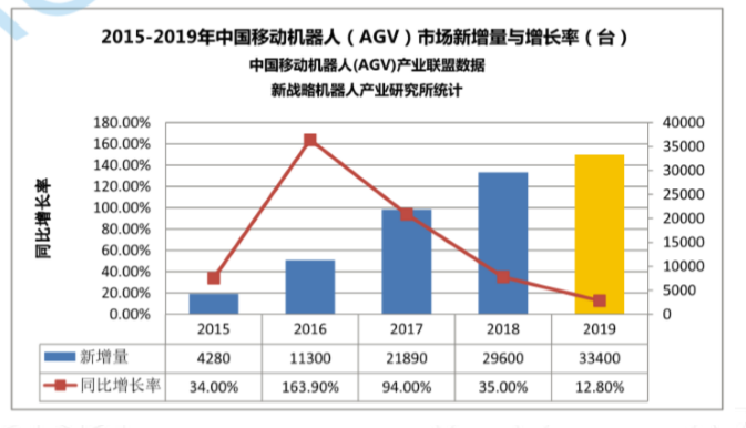 根據(jù)中國(guó)移動(dòng)機(jī)器人產(chǎn)業(yè)聯(lián)盟、新戰(zhàn)略機(jī)器人產(chǎn)業(yè)研究所數(shù)據(jù)統(tǒng)計(jì),2019 年度,中國(guó)移動(dòng)機(jī)器人 (AGV/AMR) 市場(chǎng)規(guī)模達(dá)到 61.75 億元,較之于 2018 年增長(zhǎng)幅度為 45.2%,其中營(yíng)收超億元的企業(yè)有包括曠視科技在內(nèi)的 18 家企業(yè)。2019 年移動(dòng)機(jī)器人所有品類產(chǎn)品新增量 33400 臺(tái),較之于 2018 年增長(zhǎng)約 12.8%。