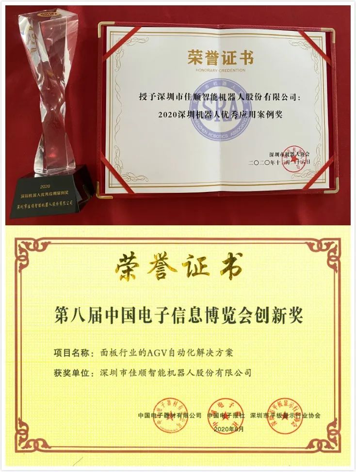 佳順智能在面板行業(yè)的大量案例應(yīng)用,已被評(píng)為深圳平板顯示協(xié)會(huì)的優(yōu)秀會(huì)員。而此應(yīng)用案例在面板顯示行業(yè)同樣獲得了廣泛的認(rèn)可,并在2020年8月的中國(guó)國(guó)際顯示產(chǎn)業(yè)大會(huì)被中國(guó)電子器材有限公司、中國(guó)電子報(bào)社、深圳平板顯示行業(yè)協(xié)會(huì)共同授予“第八屆中國(guó)電子信息博覽會(huì)創(chuàng)新獎(jiǎng)”。同時(shí)也于12月26日深圳市機(jī)器人年度頒獎(jiǎng)禮上榮獲2020年深圳機(jī)器人優(yōu)秀應(yīng)用案例獎(jiǎng)。