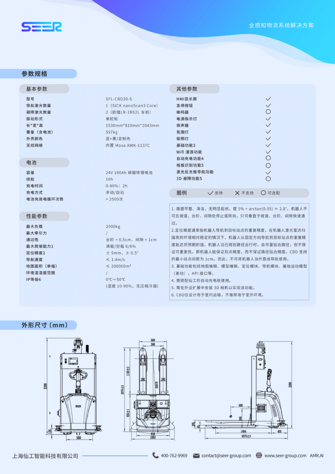 另附激光SLAM搬運(yùn)式叉車SFL-CBD20-S的參數(shù)表,讓您一覽無余: