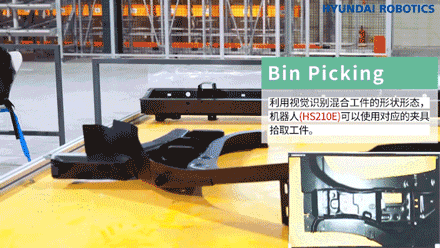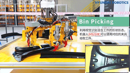 第一步,是工件的拾取。利用視覺(jué)識(shí)別混合工件的形狀和形態(tài),現(xiàn)代HS210E機(jī)器人可以使用對(duì)應(yīng)的夾具拾取工件。