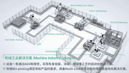 今天給大家展示的是現(xiàn)代機(jī)器人物流系統(tǒng)演示中心的一套自動(dòng)化設(shè)施。這套方案可以實(shí)現(xiàn)車(chē)身組裝、涂裝、焊接等工藝的無(wú)人值守自動(dòng)化,使用的機(jī)器設(shè)備包括現(xiàn)代工業(yè)機(jī)器人HS210E,HH010L,YP015-28,HS220等產(chǎn)品,外加AGV以及各種視覺(jué)設(shè)備。