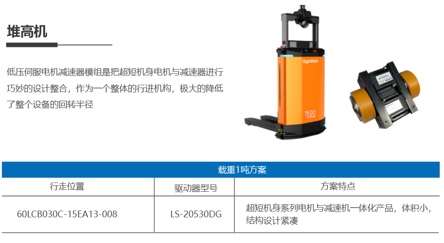 和利時(shí)電機(jī)自主研發(fā)的超短系列低壓伺服電機(jī)已大批量應(yīng)用在移動(dòng)機(jī)器人、倉(cāng)儲(chǔ)物流AGV、堆高機(jī)等對(duì)電機(jī)安裝空間要求較高的場(chǎng)合。