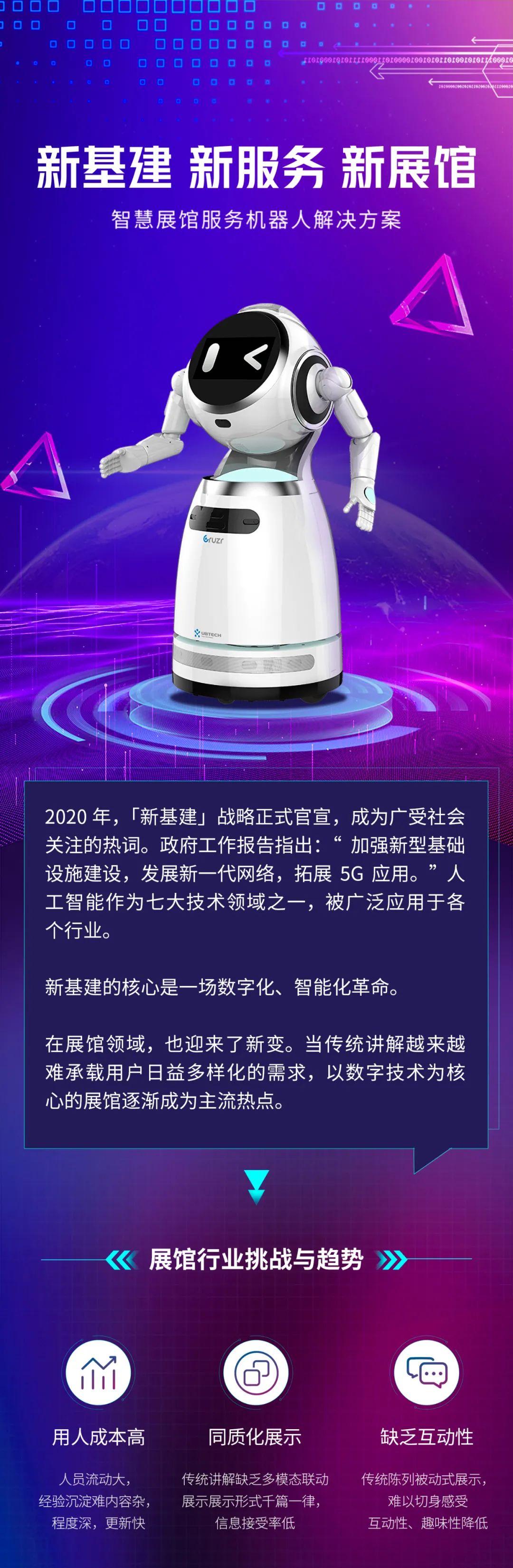 數(shù)字展館時(shí)代來(lái)臨, AI、5G、IOT、機(jī)器人等多種技術(shù)的融合將為參展觀眾帶來(lái)知識(shí)性、互動(dòng)性相結(jié)合的智慧展覽體驗(yàn)。人工智能服務(wù)是最有愛(ài)的新基建,優(yōu)必選科技以智能機(jī)器人為載體,人工智能技術(shù)為核心,打造“硬件+軟件+服務(wù)+內(nèi)容”的智能服務(wù)生態(tài)圈,推動(dòng)經(jīng)濟(jì)、社會(huì)的智能化升級(jí)。