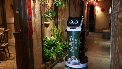 走進(jìn)深圳寶安區(qū)大仟里農(nóng)耕記餐廳,一道甜美的聲音響起。定睛一看,在門口迎接的不是服務(wù)員,而是一個(gè)具有貓系外形設(shè)計(jì)的可愛機(jī)器人!