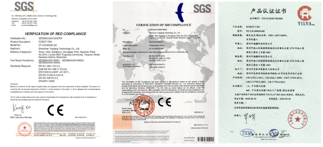 2020年6月19日,越疆科技CR5協(xié)作機器人獲得歐盟CE證書和中國CR證書。