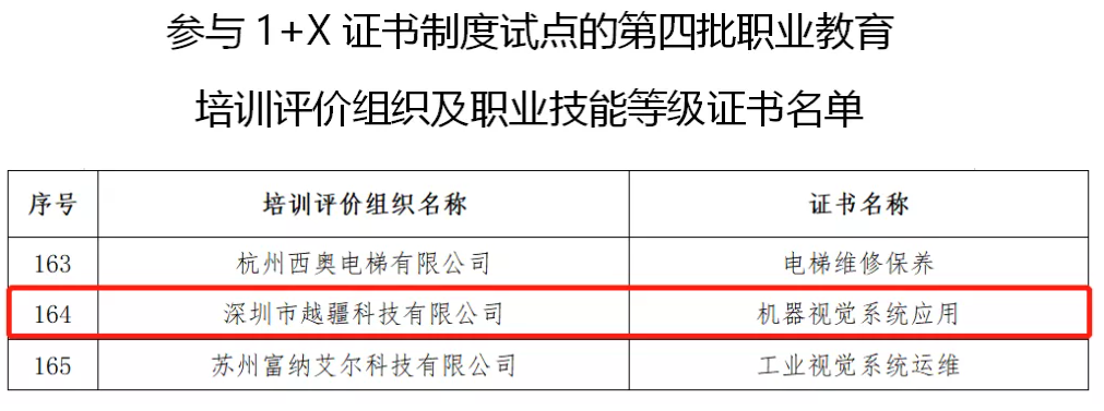 2020年12月31日,越疆科技申報的“機器視覺系統(tǒng)應(yīng)用”職業(yè)技能等級證書成功入選教育部“1+X”證書制度試點第四批職業(yè)技能等級證書名單。
