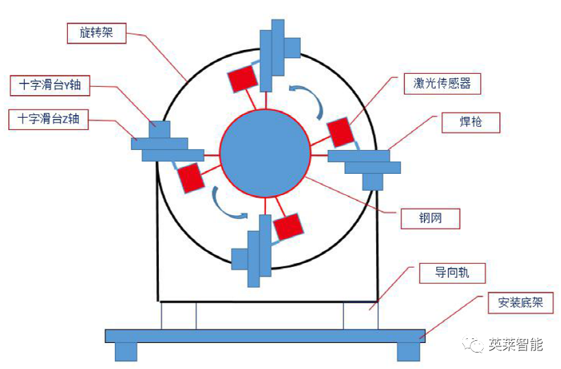 主體結(jié)構(gòu)為伺服電機(jī)控制的回轉(zhuǎn)盤(pán),轉(zhuǎn)盤(pán)上安裝有四個(gè)十字滑臺(tái),每個(gè)滑臺(tái)上均安裝有焊槍,配套英萊焊縫跟蹤系統(tǒng),能單獨(dú)實(shí)現(xiàn)兩個(gè)軸的焊縫偏差糾正功能,提高焊接精度。配套的電氣系統(tǒng),可以將此專機(jī)和現(xiàn)場(chǎng)生產(chǎn)線設(shè)備銜接起來(lái),達(dá)到連續(xù)生產(chǎn),穩(wěn)定運(yùn)行。
