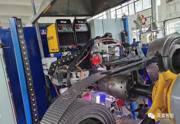 英萊孔網(wǎng)鋼帶焊接專機(jī)由唐山英萊機(jī)器人系統(tǒng)有限公司設(shè)計(jì)。環(huán)繞卷板機(jī)在定徑芯模上纏繞成螺旋管雛形,再由氬弧焊機(jī)同步進(jìn)行焊接,視覺(jué)焊縫跟蹤系統(tǒng)可自助糾正焊縫偏移,無(wú)需人工干涉。生產(chǎn)效率和產(chǎn)品質(zhì)量大幅改善。
