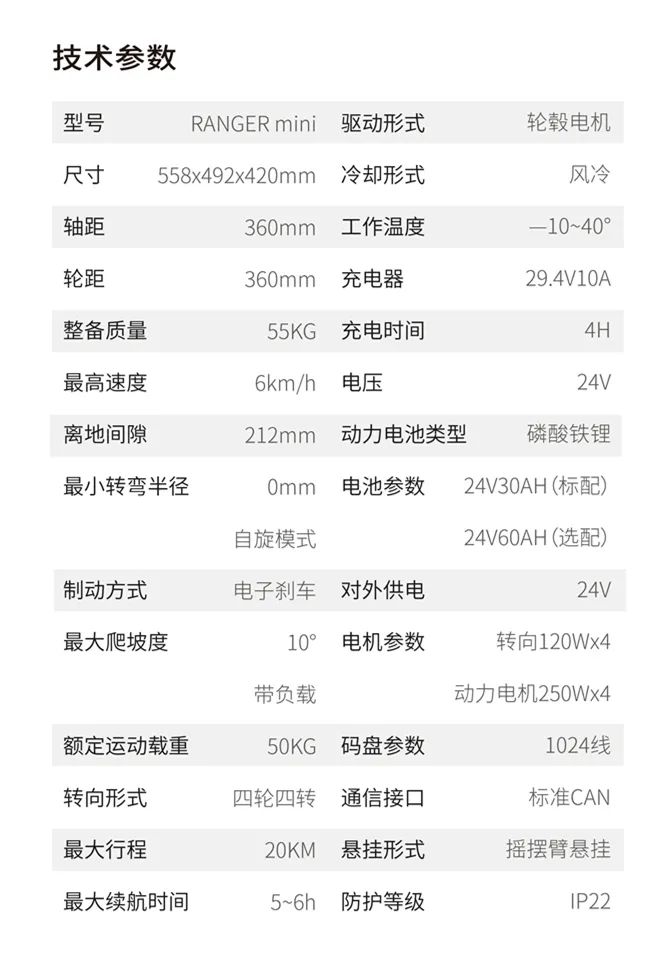 移動(dòng)靈活,性能強(qiáng)勁Ranger Mini作為一款超強(qiáng)靈活性與性能并存的UGV,容納SCOUT 系列越障攀爬與HUNTER系列高承載長續(xù)航優(yōu)點(diǎn)于一身.得益于AGILEX運(yùn)動(dòng)控制技術(shù)底蘊(yùn),室內(nèi)戶外運(yùn)行得心應(yīng)手.搖擺臂懸掛,更高的離地間隙,為室內(nèi)外作業(yè)帶來全新的移動(dòng)體驗(yàn).