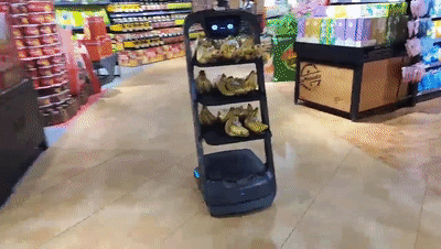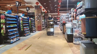 2020年,普渡配送機器人“歡樂送”一舉進入6家蘭州聚品匯客超市,12臺機器人在超市里歡快地巡航,為超市的促銷活動出一把力。
