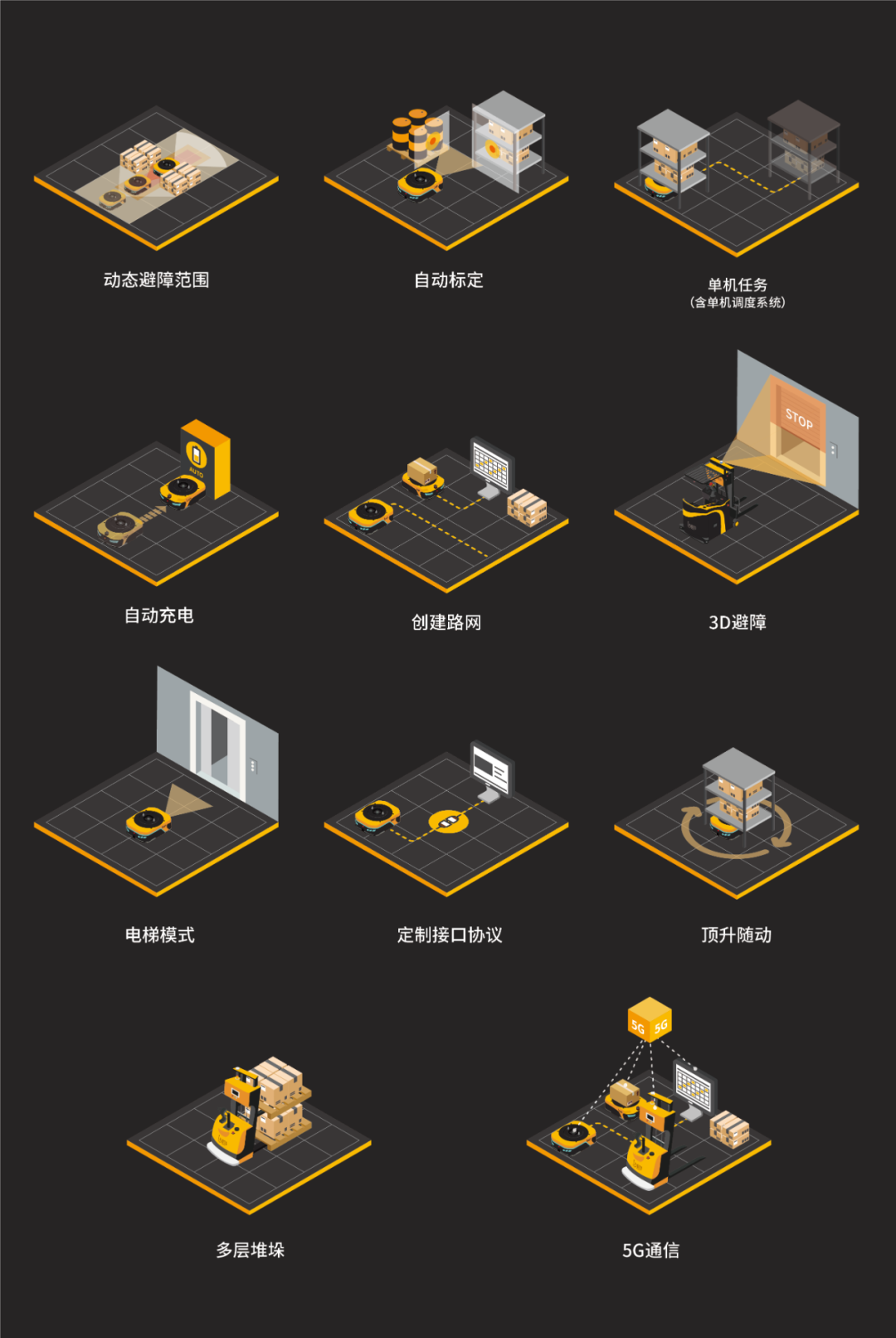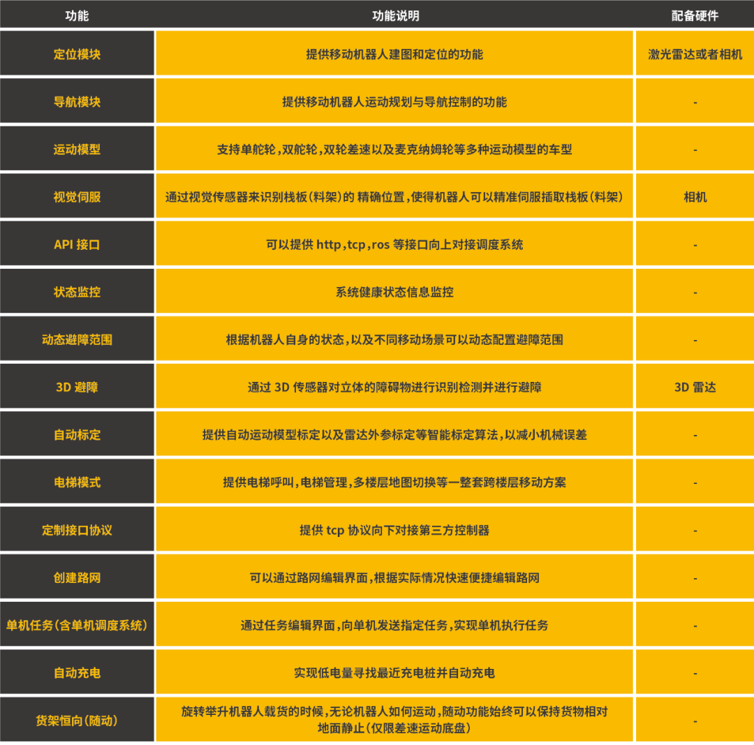 可支持多種避障形式,精準(zhǔn)避障、分區(qū)避障和三段避障(減速、停車和急停),并實(shí)時(shí)計(jì)算內(nèi)核搭配完備的3D避障方案(配備3D傳感器),保障移動(dòng)機(jī)器人安全穩(wěn)定運(yùn)行。支持多傳感器安全防護(hù),包括但不限于激光、碰撞條、超聲、光電等軟擴(kuò)展。功能列表
