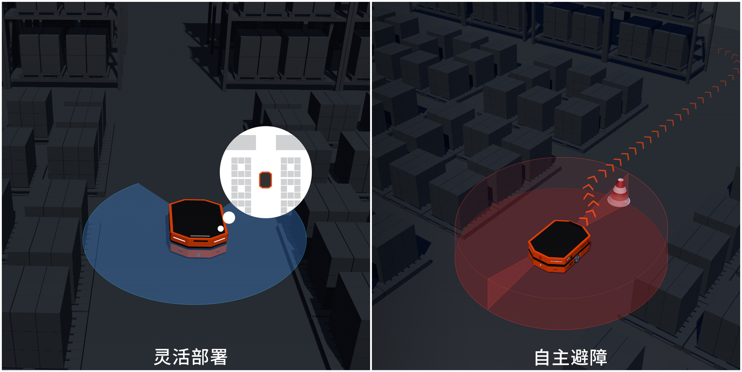 而能夠自主導(dǎo)航的AMR,相當(dāng)于應(yīng)用“無人駕駛”技術(shù)的一類產(chǎn)品。通過改進(jìn)的SLAM技術(shù)構(gòu)建地圖,根據(jù)地圖信息進(jìn)行定位,并不需要鋪設(shè)固定的信標(biāo),部署簡易快捷,并且能憑借高度智能的AI決策系統(tǒng)進(jìn)行避障、繞行,自主規(guī)劃路線,無需特地為設(shè)備開辟專屬通道,既能在復(fù)雜動態(tài)的場景與人/叉車“和諧共處”,又能在生產(chǎn)空間較為局限的場景中從容勝任搬運任務(wù)。