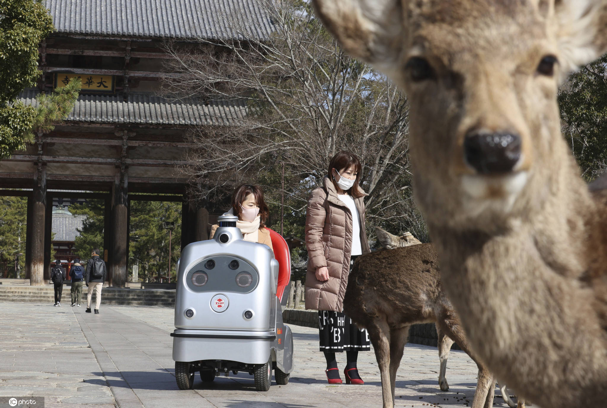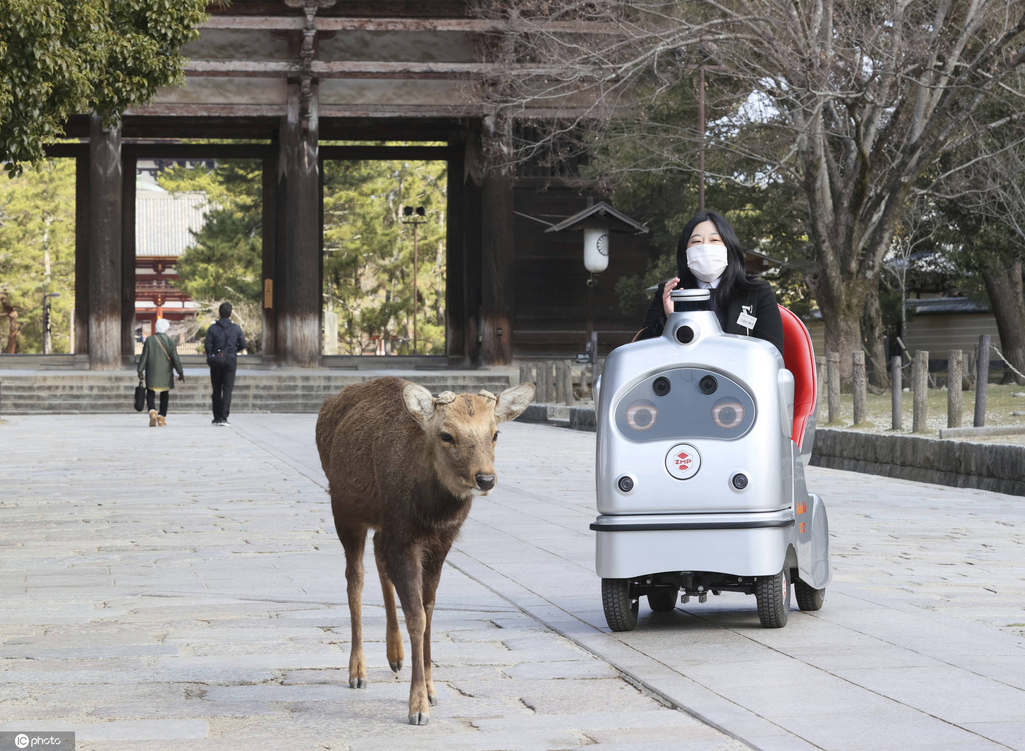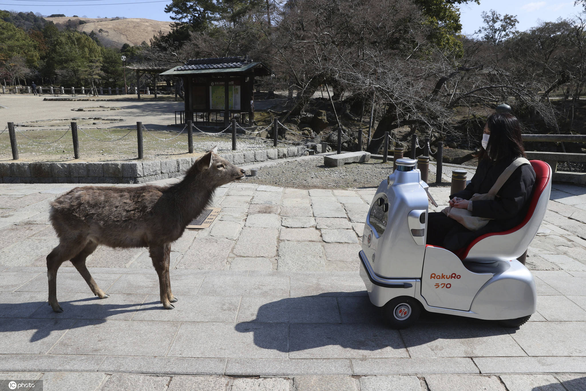 當(dāng)?shù)貢r間2021年2月24日,日本奈良,單人乘坐的自動駕駛機器人RakuRo在奈良公園進行試運行。