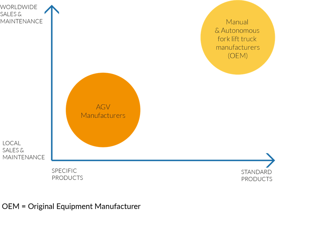 特定的AGV(自動導(dǎo)引車)、在工業(yè)上已經(jīng)存在了近30年的傳統(tǒng)自動車輛以及將標(biāo)準(zhǔn)手動叉車轉(zhuǎn)變?yōu)樽詣榆囕v,它們都有相同的用途,可以在垂直和水平方向上運輸貨盤或貨物。它們的區(qū)別在于技術(shù)選擇、產(chǎn)品線的深度和分銷策略。