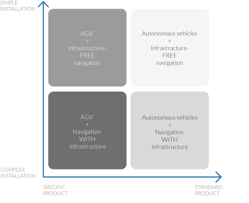 AGV是專為客戶應(yīng)用而設(shè)計的。它們是小批量生產(chǎn)的,其導(dǎo)航系統(tǒng)是基于附加的基礎(chǔ)設(shè)施(地面、墻壁、機架、機器等)來允許機器移動并知道其在空間中的位置。AGV制造商的產(chǎn)品供應(yīng)是由項目/客戶組織的。