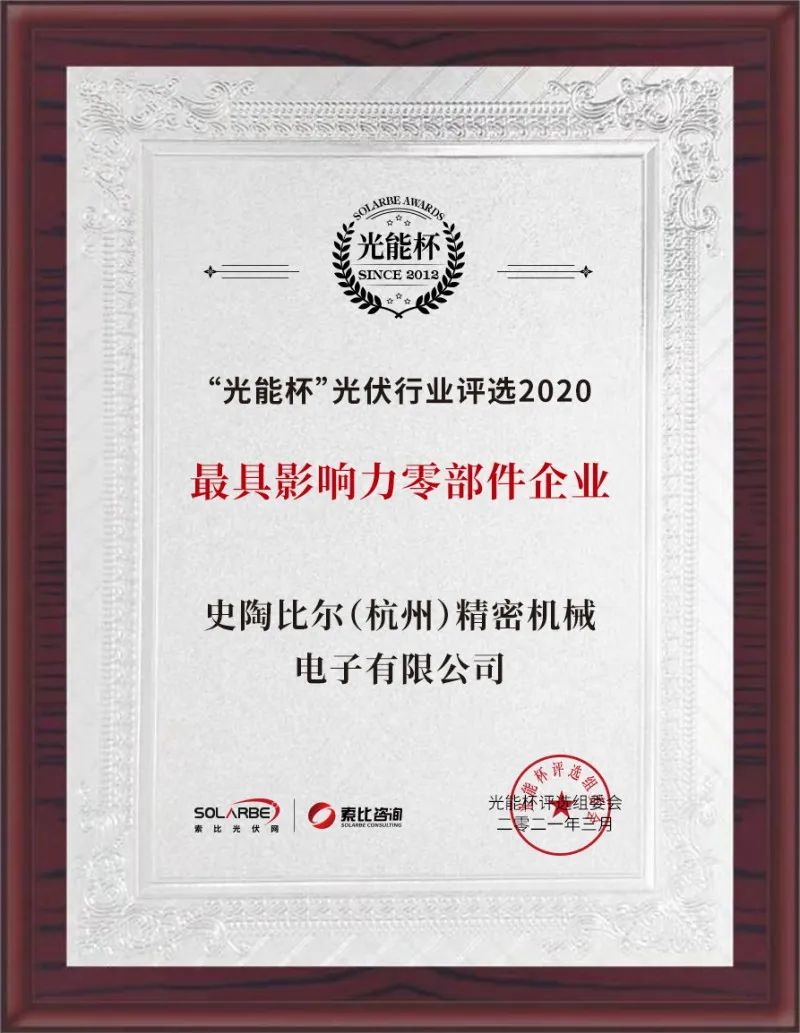 3月3日,由索比光伏網(wǎng)和索比咨詢聯(lián)合主辦的2020年度“光能杯”跨年分享會暨頒獎典禮,在蘇州園區(qū)香格里拉酒店圓滿落幕。史陶比爾憑借過硬的產品品質和高效的服務,蟬聯(lián)“最具影響力光伏零部件企業(yè)”殊榮。