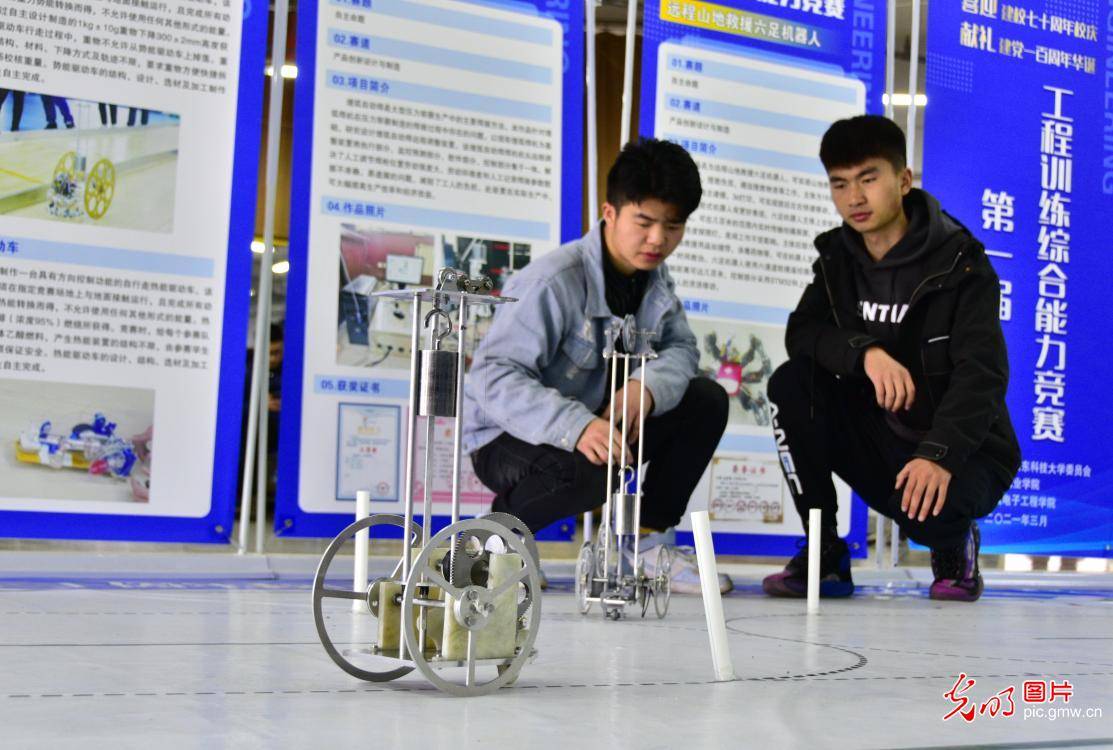 2021年3月13日,位于山東青島的山東科技大學(xué)舉辦了大學(xué)生工程訓(xùn)練綜合能力競賽,數(shù)百名大學(xué)生攜帶自主制作的智能機(jī)器人,同臺(tái)競技智能物流搬運(yùn)、水下管道智能巡檢、生活垃圾智能分類等項(xiàng)目的比賽,在競賽中挑戰(zhàn)產(chǎn)品創(chuàng)新設(shè)計(jì)、關(guān)鍵核心技術(shù)開發(fā),感受智能機(jī)器人的魅力,提升自主創(chuàng)新能力。圖為大學(xué)生自主設(shè)計(jì)的工程機(jī)器人在參加智能避障競技。(韓洪爍攝/光明圖片)