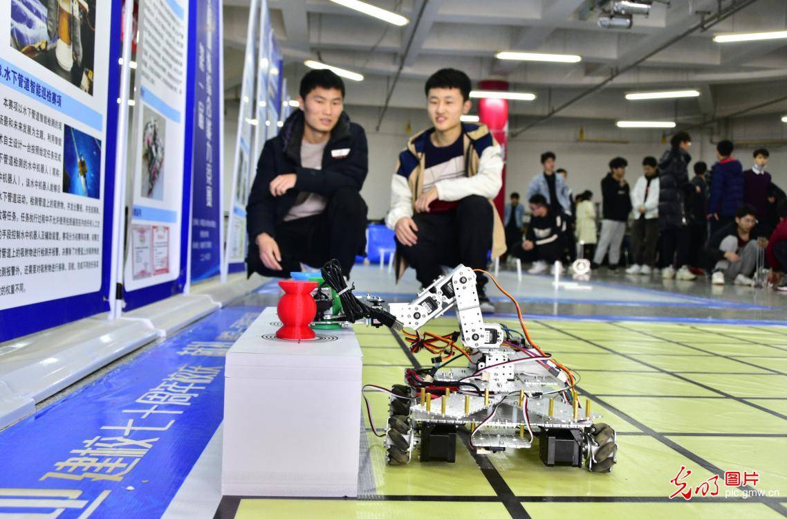 2021年3月13日,位于山東青島的山東科技大學(xué)舉辦了大學(xué)生工程訓(xùn)練綜合能力競賽,數(shù)百名大學(xué)生攜帶自主制作的智能機(jī)器人,同臺(tái)競技智能物流搬運(yùn)、水下管道智能巡檢、生活垃圾智能分類等項(xiàng)目的比賽,在競賽中挑戰(zhàn)產(chǎn)品創(chuàng)新設(shè)計(jì)、關(guān)鍵核心技術(shù)開發(fā),感受智能機(jī)器人的魅力,提升自主創(chuàng)新能力。圖為學(xué)生制作的智能機(jī)器人在挑戰(zhàn)智能物流搬運(yùn)項(xiàng)目。(韓洪爍攝/光明圖片)
