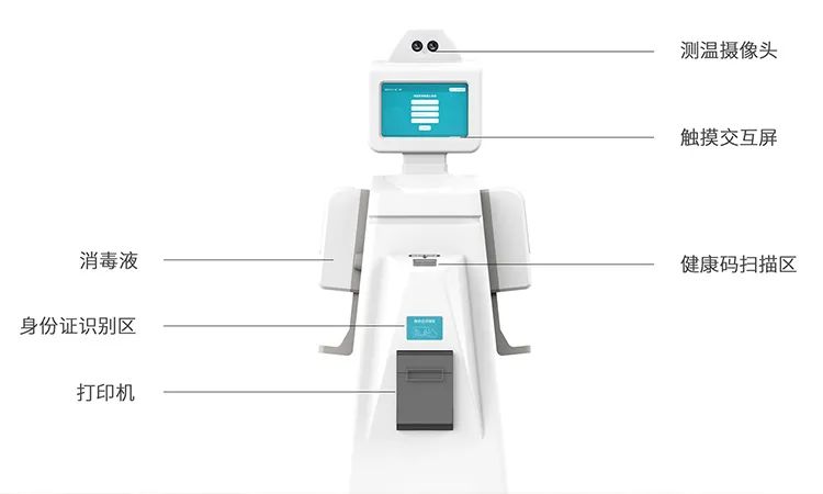 A. 一站式服務(wù):一臺機(jī)器人即可快速完成一位人員的消毒、測溫、掃碼、身份確認(rèn)等一整套登記流程。
