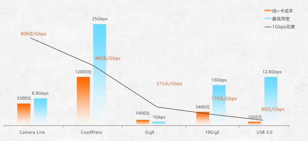 目前主流接口中, GigE的數(shù)據(jù)帶寬為1Gbps,USB 3.0為3.2Gbps,Camera Link為6.8Gbps(80-bit),10GigE為10Gbps,CXP-6為25Gbps(4link)。其中,萬兆網(wǎng)的帶寬僅次于CoaXPress,是高數(shù)據(jù)帶寬的代表接口之一[1]。
