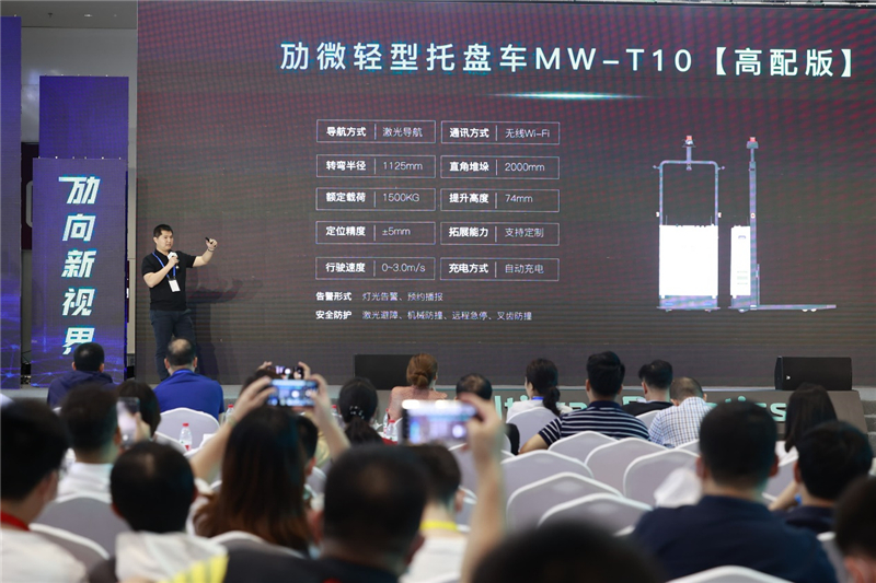 圖:勱微機器人CMO王川龍先生介紹輕型托盤車MW-T10