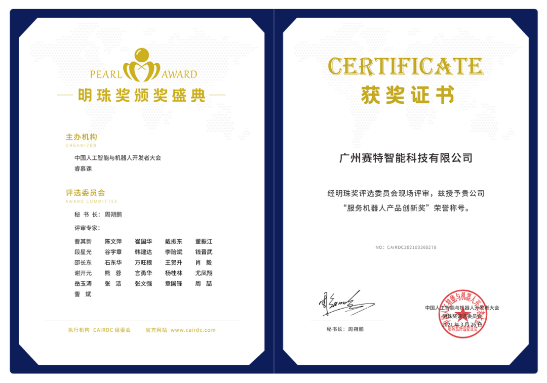 為了落地大會(huì)促進(jìn)科技創(chuàng)新的作用,大會(huì)特邀26位科學(xué)家、專家、投資機(jī)構(gòu)負(fù)責(zé)人參與明珠獎(jiǎng)的評(píng)選。賽特智能自主研發(fā)的智賽拉·智能感控機(jī)器人在眾多優(yōu)秀參評(píng)產(chǎn)品中脫穎而出,榮獲“明珠獎(jiǎng)-服務(wù)機(jī)器人產(chǎn)品創(chuàng)新獎(jiǎng)”榮譽(yù)獎(jiǎng)項(xiàng)。