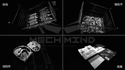 ▲典型工件(曲軸、鏈軌節(jié)、結(jié)構(gòu)件)和紙箱的點云圖由新一代Mech-Eye Laser工業(yè)級激光3D相機生成