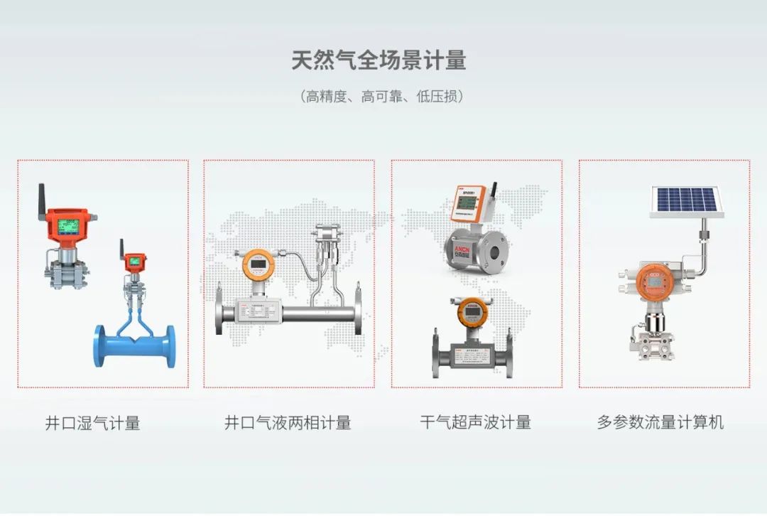 安森智能儀器儀表族群全方位滿足油氣田過程控制中壓力、溫度、流量、液位等計量需求。針對天然氣領域,安森智能特推出井口濕氣、干氣、氣液兩相等全場景計量解決方案,實現(xiàn)天然氣全天候實時精準計量和貿易交接計量。