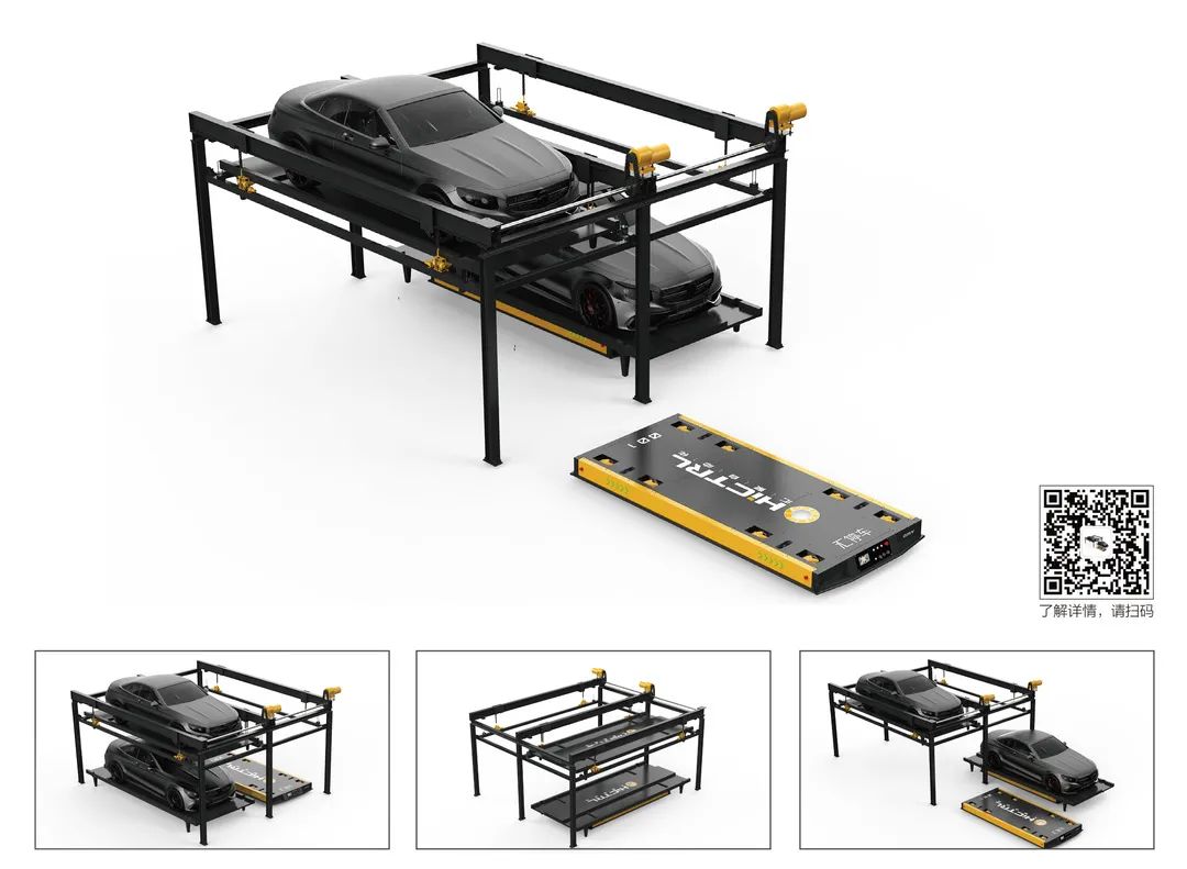 ●與8輪8驅載車板智能停車機器人組合成全自動二層停車系統(tǒng)。