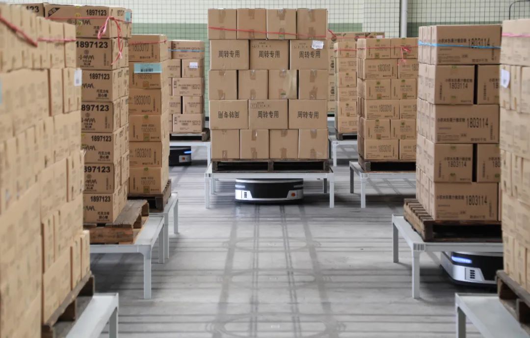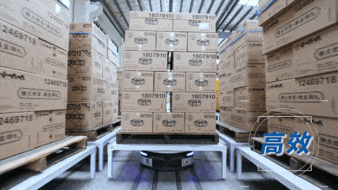每臺(tái)智能搬運(yùn)機(jī)器人(AGV),一次能舉起數(shù)百公斤的貨物,現(xiàn)場(chǎng)無需看管,需要充電時(shí)會(huì)自行充電,夜晚也能在黑燈情況下照常運(yùn)行。
