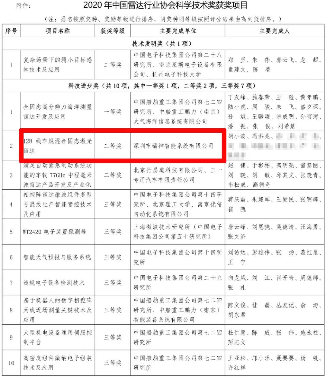 鐳神智能車規(guī)級(jí)128線混合固態(tài)激光雷達(dá)以領(lǐng)先國際的產(chǎn)品性能獲得了一眾院士專家評(píng)委的高度認(rèn)可,榮獲科技進(jìn)步二等獎(jiǎng)。