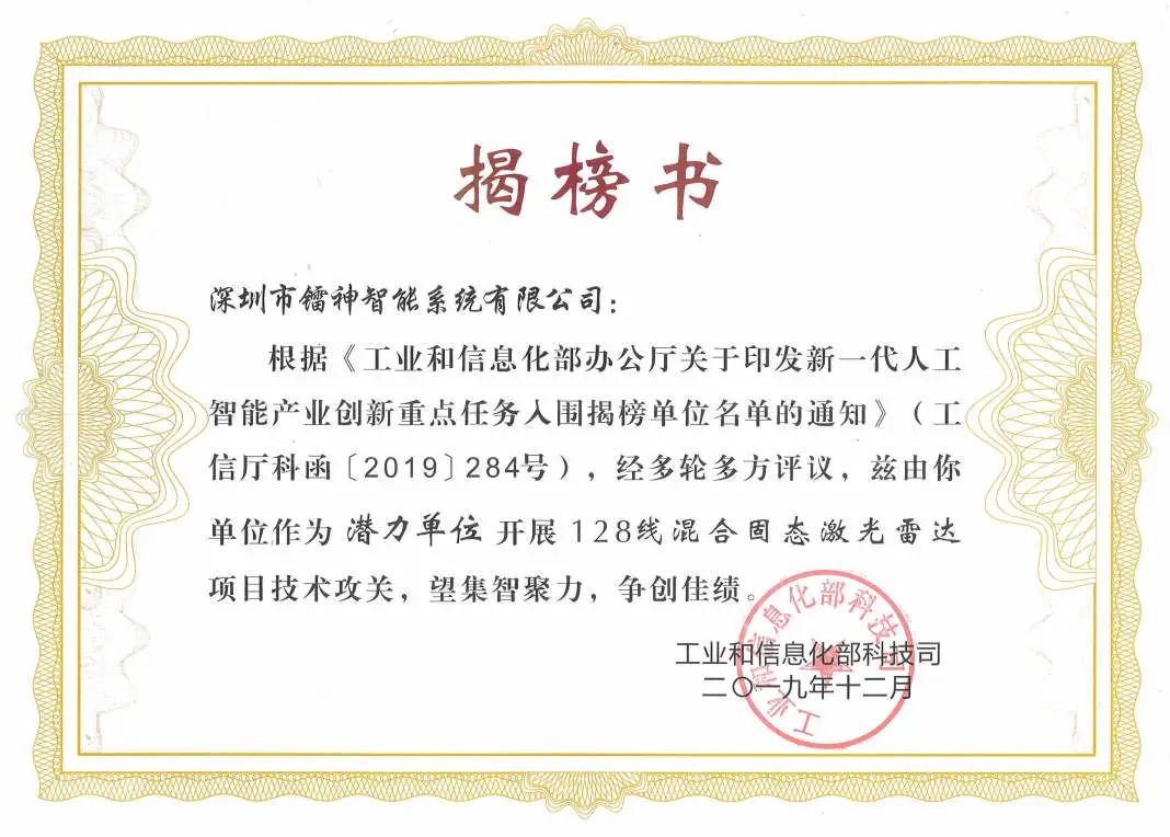 鐳神智能憑借雄厚實(shí)力和優(yōu)秀業(yè)績,得到了國家及地方政府部門的一致認(rèn)可:榮獲 2020 年國家科 技進(jìn)步二等獎(jiǎng);成功入選“國家工信部新一代人工智能產(chǎn)業(yè)創(chuàng)新重點(diǎn)任務(wù)優(yōu)勝揭榜單位”;獲廣東省科 技廳認(rèn)定為“廣東省激光雷達(dá)工程技術(shù)研究中心”; 實(shí)力斬獲 2019 廣東省重點(diǎn)領(lǐng)域研發(fā)計(jì)劃“新能 源汽車”重大科技專項(xiàng);成功入選國家級(jí)專精特新“小巨人”企業(yè)。