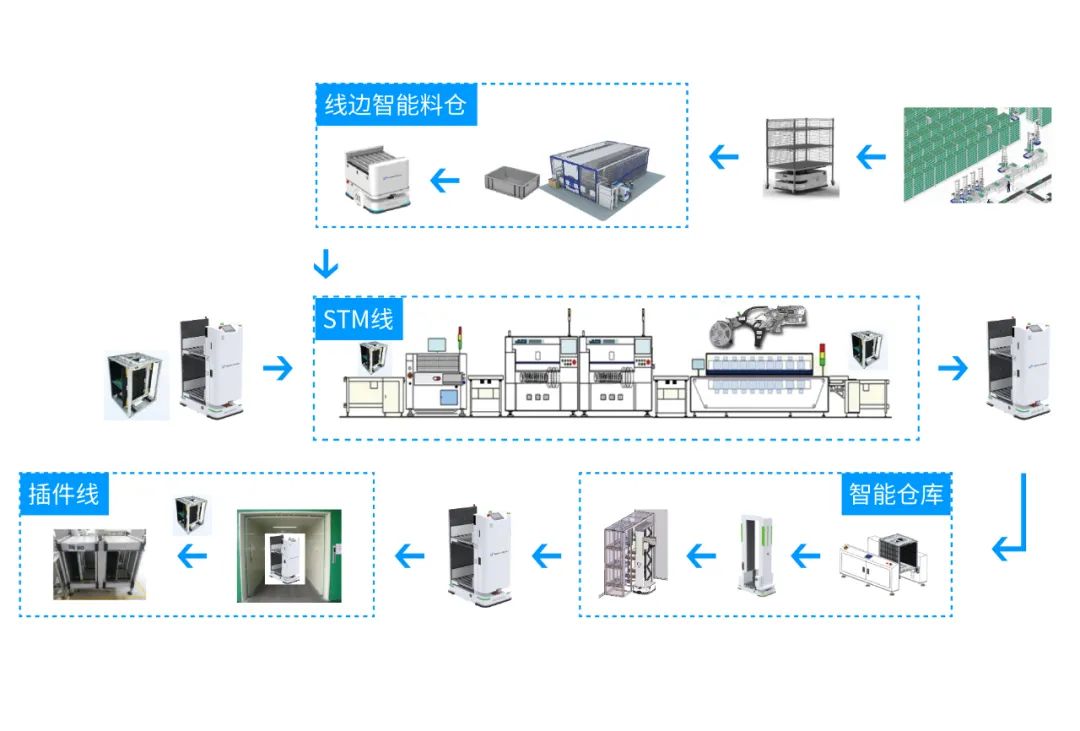 如在3C生產(chǎn)的SMT段,從總倉(cāng),到線邊倉(cāng)/備料區(qū),到SMT產(chǎn)線,到SMT暫存,以及將SMT成品送到下一個(gè)生產(chǎn)工序。搭配倉(cāng)庫(kù)管理系統(tǒng),倉(cāng)儲(chǔ)機(jī)器人,物料搬運(yùn)機(jī)器人,智能電梯,中控及調(diào)度系統(tǒng),實(shí)現(xiàn)全段的智能配送。