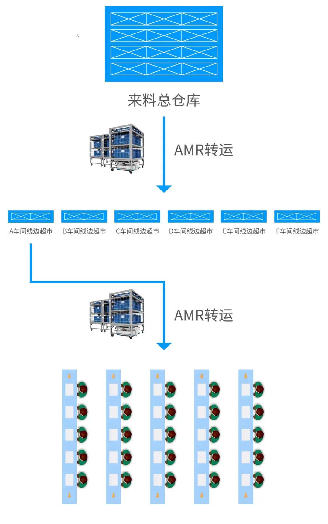 裝配段主要是將原料送到生產(chǎn)線。在原始人工配送情況下,裝配線線邊一般會堆積一個班的生產(chǎn)物料,導(dǎo)致現(xiàn)場庫存增加。導(dǎo)入柔性物流方案后,可以通過少量多次的配送方式,減少線邊物料堆積。同時通過線邊庫位管理系統(tǒng),實時了解產(chǎn)線用料情況,實現(xiàn)物料信息透明化。