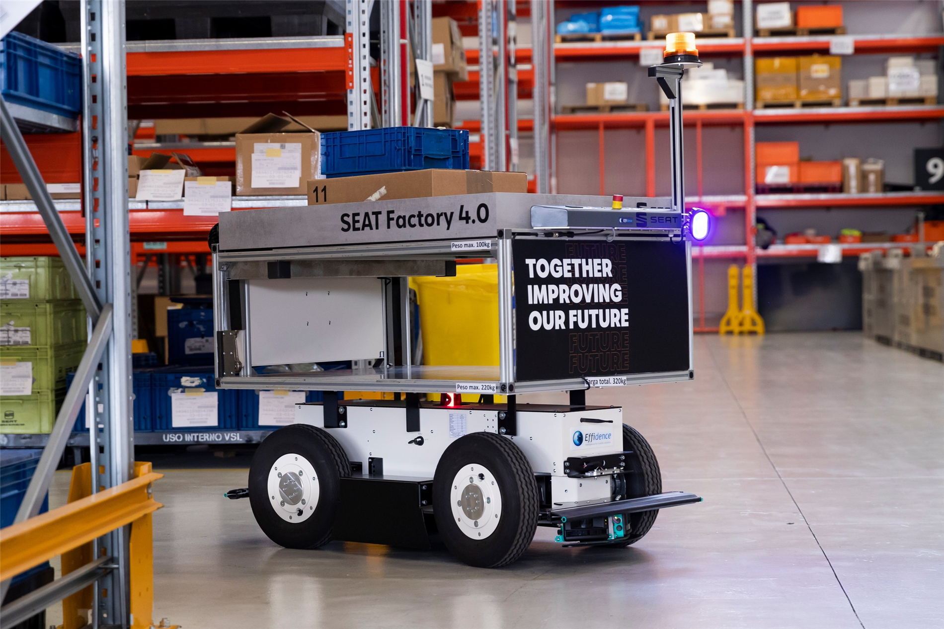 EffiBOT是由法國Effidence公司開發(fā)的機器人,SEAT與該公司合作以調(diào)整其在Martorell工廠的業(yè)務。機器人可以處理360°恒定的讀數(shù),當他們在工廠中移動時,它可以跟隨輕觸觸摸屏的人員,并能夠以他們的方式在人或物體周圍導航。