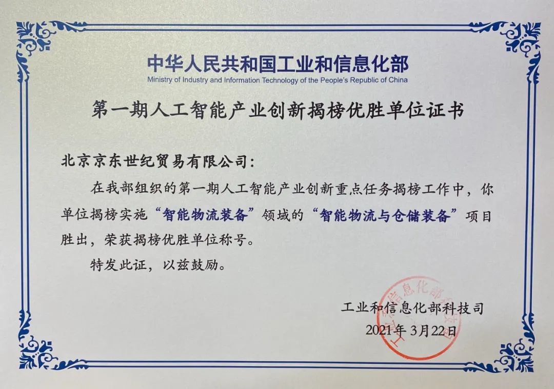 早在2019年底,京東物流“智能物流與倉儲裝備”就入選“新一代人工智能產業(yè)創(chuàng)新重點任務入圍揭榜單位名單”。歷經實地考察、專家評議和第三方專業(yè)機構測評等多維度評價,成為首批重點任務揭榜優(yōu)勝單位,充分說明對京東物流領先技術與成果的認可。