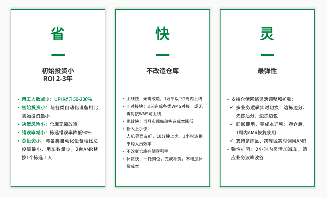 針對物流業(yè),靈動科技的端到端無人駕駛智慧倉庫方案可覆蓋出入庫、補貨、揀選、搬運的全生產(chǎn)環(huán)節(jié),支持先揀后分、邊揀邊分、邊揀邊包等多種揀選方式,每2臺AMR能夠提升每人揀選效率50-200%。