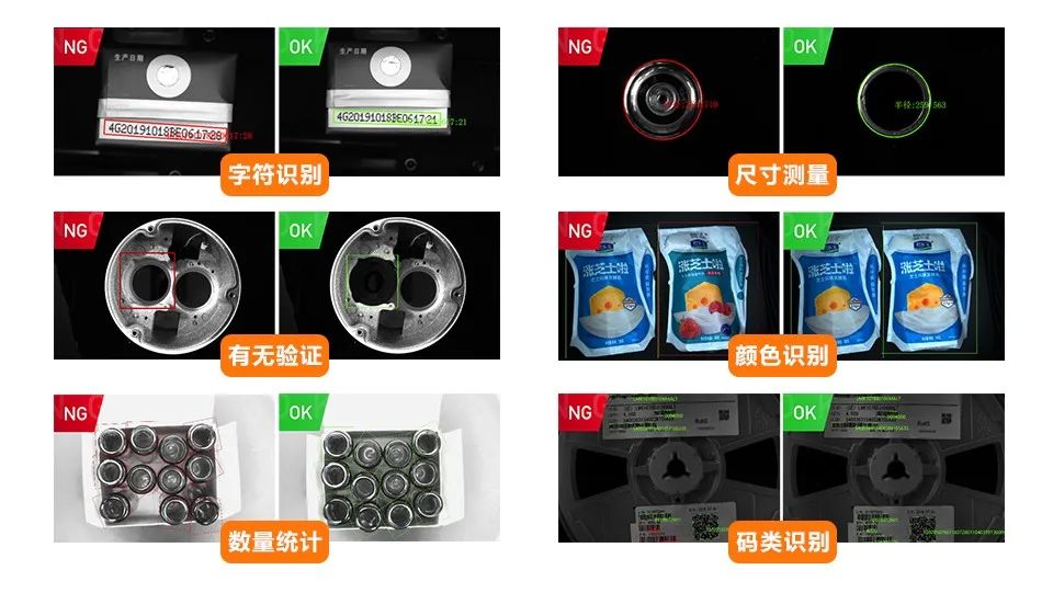 SC3000提供有無、正反、位置、尺寸、字符、碼等20種檢測算法用于常見的防錯檢測,為單工位的視覺檢測提供強(qiáng)大助力。有無工具:圖案、斑點(diǎn)、邊緣、圓、直線計數(shù)工具:圖案計數(shù)、斑點(diǎn)計數(shù)、邊緣計數(shù)測量工具:亮度測量、對比度測量、灰度面積、顏色面積、直徑測量、寬度測量、線線夾角、點(diǎn)線測量、直線角度識別工具:字符識別、碼識別、顏色比較