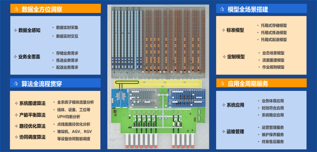 基于“孿生技術(shù)+倉(cāng)儲(chǔ)”的理念,以客戶的“需求、瓶頸、痛點(diǎn)”等為設(shè)計(jì)約束條件,以“堆垛機(jī)、穿梭車RGV、AGV/AMR”等硬件產(chǎn)品為輸入載體,以“倉(cāng)儲(chǔ)管理系統(tǒng)WMS、倉(cāng)儲(chǔ)控制系統(tǒng)WCS”等軟件產(chǎn)品為決策大腦,通過(guò)孿生建模不斷迭代優(yōu)化規(guī)劃設(shè)計(jì)方案,最終,提供一套適用于不同行業(yè)不同場(chǎng)景不同物理布局的智能倉(cāng)儲(chǔ)解決方案。