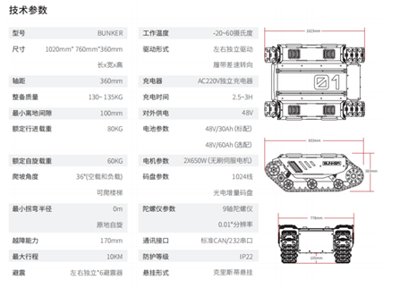 底盤這部分相當(dāng)于機(jī)器人的腿腳,從外觀上來看,整體設(shè)計(jì)上,BUNKER采用一體前傾設(shè)計(jì),設(shè)計(jì)風(fēng)格則是明顯的硬朗工業(yè)風(fēng)。據(jù)了解,BUNKER的底盤配備了2組650W的無刷伺服電機(jī),采取左右獨(dú)立驅(qū)動(dòng),能提供極強(qiáng)動(dòng)力及差速自轉(zhuǎn)能力,在懸掛上所采取克里蒂斯懸掛的同時(shí),還左右獨(dú)立搭配了多組避震器,為其提供了更強(qiáng)的穩(wěn)定性,而裝備自重僅僅只有130KG。
