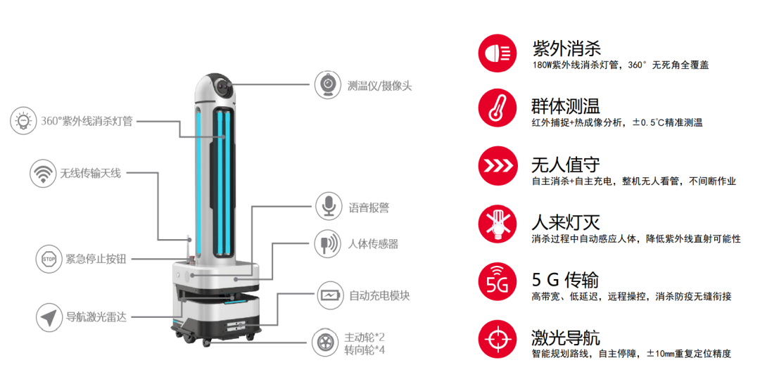 消殺機(jī)器人采用白加黑的模式:白天配合醫(yī)護(hù)人員在醫(yī)院主要出入口全自動(dòng)巡航執(zhí)勤,能在人群中高效精準(zhǔn)測(cè)量體溫,一旦發(fā)現(xiàn)體溫異常人員會(huì)第一時(shí)間報(bào)警提示給醫(yī)生;晚上根據(jù)規(guī)劃的路線,對(duì)門(mén)診、急診、感染區(qū)自動(dòng)紫外線消殺,避免人員接觸的前提下有效避免病毒傳播,降低一線防疫消殺人員的工作強(qiáng)度,增大單位時(shí)間內(nèi)消殺面積。