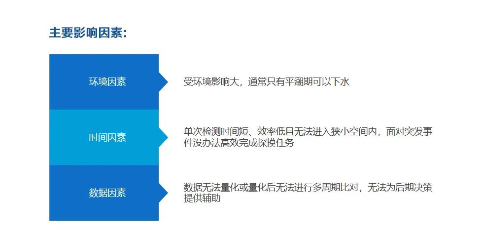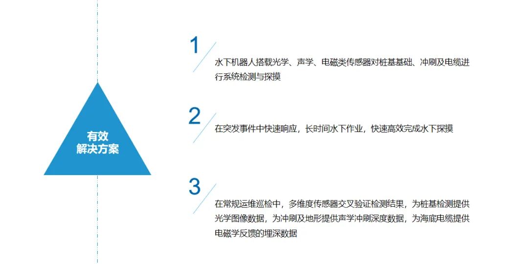海上風(fēng)電運(yùn)維主要分為樁基基礎(chǔ)檢測(cè)、沖刷及地形檢測(cè)和海纜檢測(cè)。傳統(tǒng)檢測(cè)主要是潛水員摸排及船載淺地層剖面儀掃測(cè)。主要面對(duì)的問(wèn)題有:受環(huán)境影響大,通常只有平潮期可以下水,單次檢測(cè)時(shí)間短、效率低且無(wú)法進(jìn)入狹小空間內(nèi),面對(duì)突發(fā)事件沒(méi)辦法高效完成探摸任務(wù);數(shù)據(jù)無(wú)法量化或量化后無(wú)法進(jìn)行多周期比對(duì),無(wú)法為后期決策提供輔助。