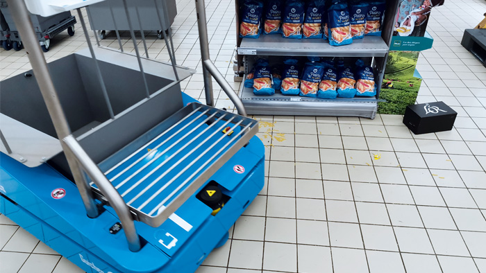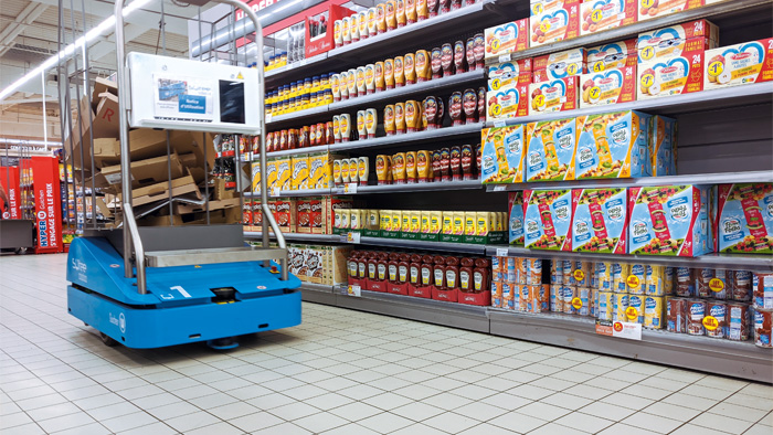 多虧了各種傳感器,移動機器人可以自己從 A 點移動到 B 點。它可以設置路線,在靜止的障礙物(叉車、箱子)之間穿梭,遇到人時減速或停下來,甚至在路徑阻塞時計算新路線,它還能夠以適當?shù)哪J礁S人。