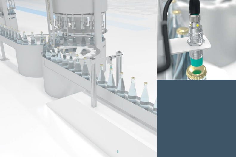 在飲料加工行業(yè),檢查瓶身是否有金屬蓋子或存在異常凹陷。該應用要求在很高的輸送速度下提前發(fā)現(xiàn)殘次品。新一代圓柱形開關的高頻率特性可以很好的滿足這個應用;同時新開關的防護等級提升至 IP68,使得食品包裝行業(yè)客戶在清洗和維護設備時更加方便和從容。新產(chǎn)品采用的白色青銅鍍層也可以提供極佳的耐化學腐蝕性能。
