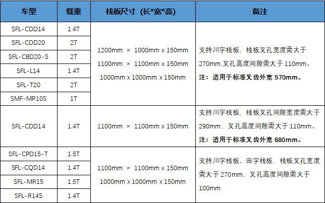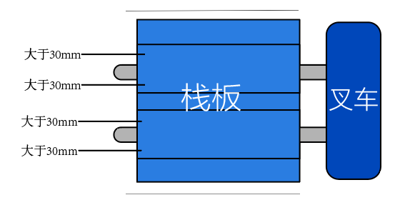 棧板長度建議不要超出叉齒長度5公分,棧板內(nèi)側(cè)兩側(cè)距離與叉齒兩側(cè)需分別大于30mm。