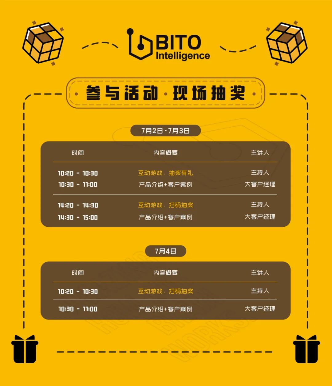 活動(dòng)時(shí)間:7月2-4日,BITO專(zhuān)家分享技術(shù)干貨和最新的行業(yè)應(yīng)用,歡迎到現(xiàn)場(chǎng)與我們交流,更有眾多精美小禮品等你來(lái)領(lǐng)。