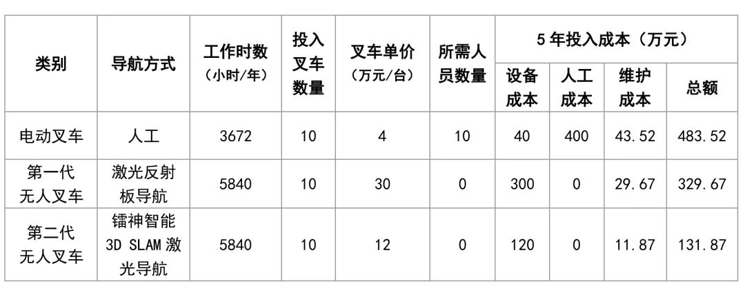 上表假定了某倉庫分別投入10輛電動叉車、激光反射板導航叉車、3D SLAM激光導航叉車,并以5年折舊進行投資回報對比分析。顯然,人工操作的電動叉車投入成本最高,經(jīng)濟回報效益最低;激光反射板導航叉車雖然單臺叉車成本高,但在五年折舊期后總投入還是比人工的電動叉車要節(jié)省了153.85萬元,近32%的成本;而采用鐳神智能3D SLAM激光導航方案的無人叉車,五年總投入成本僅131.87萬,比人工電動叉車節(jié)省了73%的投入成本、59%的時間成本,而且五年期間倉庫可以靈活進行擴建或調(diào)整,全面滿足工業(yè)互聯(lián)網(wǎng)時代下客戶終端市場隨時變化的需求,具有更突出的綜合效益!