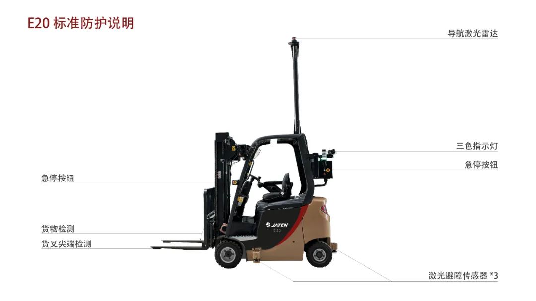 另外,E20集成了嘉騰自研的無(wú)人叉車(chē)專(zhuān)用控制箱(激光導(dǎo)航),保證無(wú)人叉車(chē)作業(yè)的穩(wěn)定與可靠。* 經(jīng)測(cè)試,在車(chē)況佳、定位條件、地面條件較好的情形,E20無(wú)人叉車(chē)的停止精度是±10mm。
