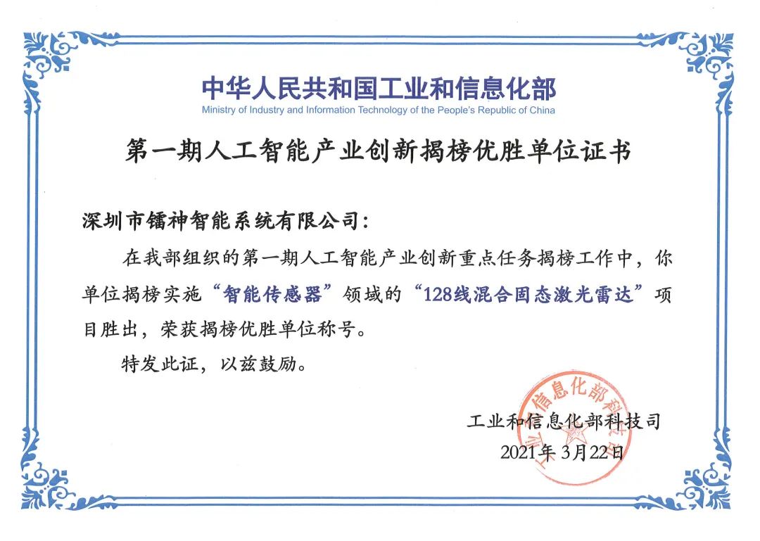 鐳神智能集結(jié)了研發(fā)精銳力量對128線混合固態(tài)激光雷達(dá)的多方面性能進(jìn)行技術(shù)攻關(guān)和持續(xù)優(yōu)化,以“128線混合固態(tài)激光雷達(dá)”項目入選“第一期人工智能產(chǎn)業(yè)創(chuàng)新重點任務(wù)入圍揭榜單位名單”。本次工信部對揭榜單位評優(yōu),鐳神智能為廣東省唯一入選的激光雷達(dá)公司,充分表明了對鐳神智能領(lǐng)先的激光感知技術(shù)與成果的認(rèn)可。