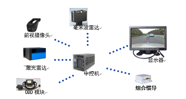 汽車車頂安裝激光雷達(dá)一體化結(jié)構(gòu),其中固定有正前方安裝CH128X1混合固態(tài)激光雷達(dá),兩側(cè)和后方安裝CH64W大視場(chǎng)補(bǔ)盲激光雷達(dá),同時(shí)前方安裝有短焦與長(zhǎng)焦攝像頭,兩側(cè)和后面安裝廣角攝像頭,同時(shí)集成有GPS組合慣導(dǎo),毫米波雷達(dá)安裝在車輛正前方車牌附近,進(jìn)行多傳感器融合感知,對(duì)車輛周邊360°范圍內(nèi)全范圍檢測(cè),提高系統(tǒng)的穩(wěn)定性及檢測(cè)精度。